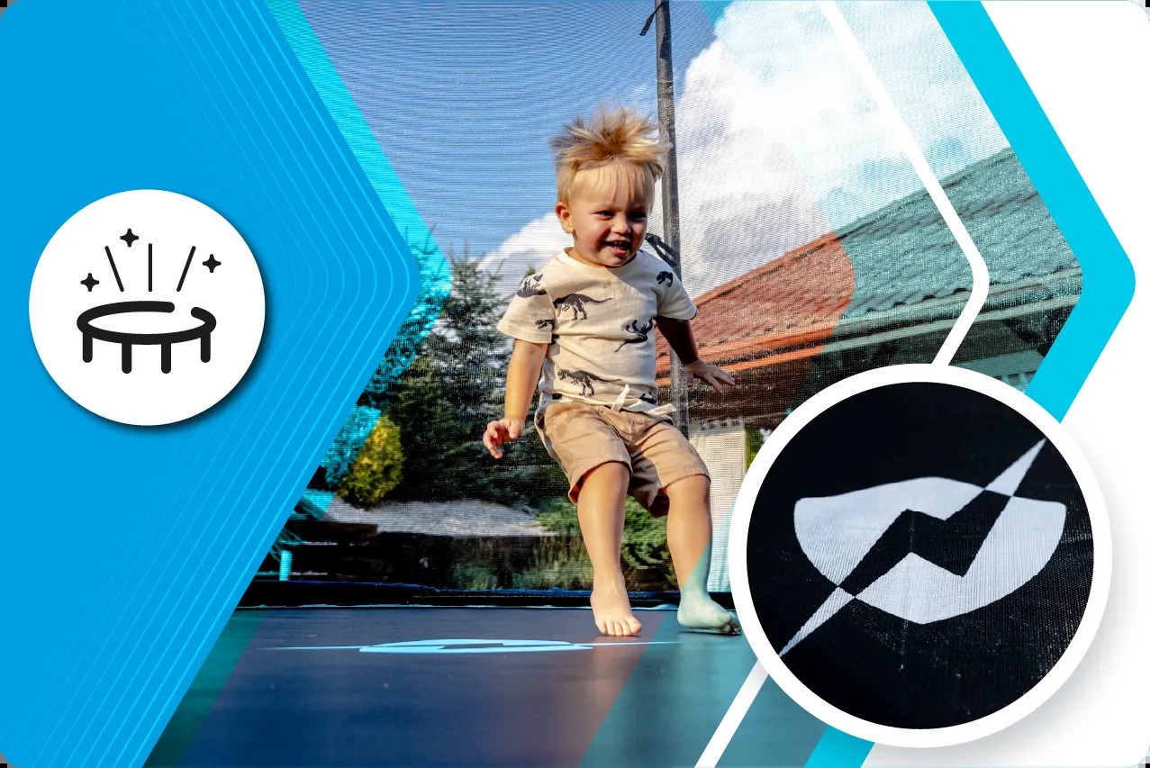 Масивне плетіння батута THUNDER гарантує тривале використання. Завдяки шестикратному прошиванню по всьому периметру, пружинні тримачі забезпечують стійкість до найвищих навантажень, що призводить до безпеки користувачів. Стійкість до ультрафіолетового випромінювання також гарантує збереження інтенсивності кольорів та естетичного вигляду протягом багатьох років.
