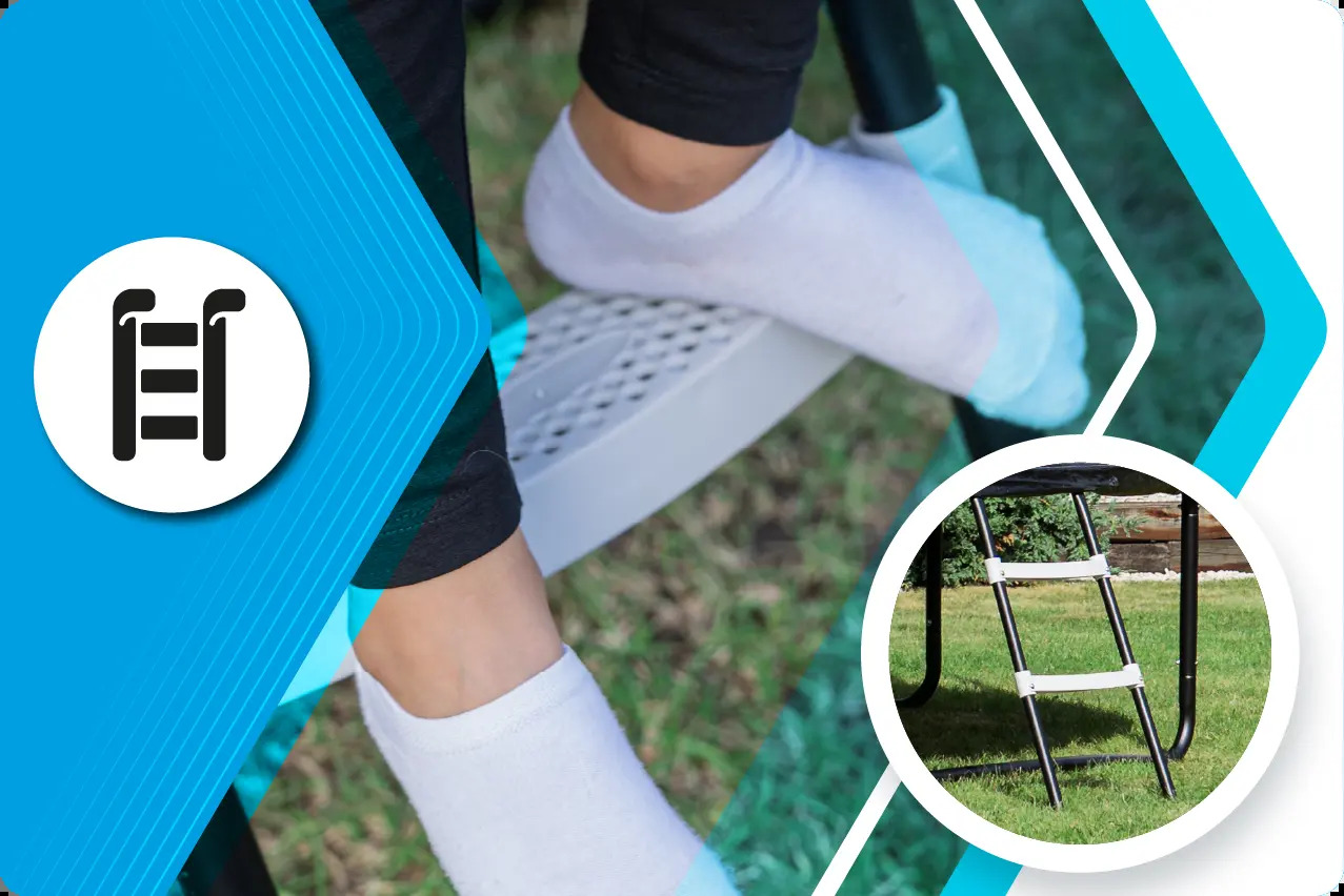 Сходинки на батуті забезпечують безпечний вхід та вихід завдяки рельєфним порожнистим сходам. Спеціально профільовані протиковзкі сходинки підвищують стійкість та безпеку користувачів, особливо дітей.