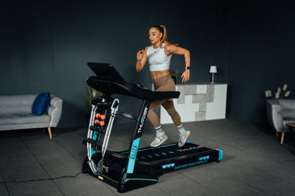 Бігова доріжка електрична THUNDER ELITE-DS-BLACK— преміальна модель польського бренду THUNDER для інтенсивних домашніх тренувань. Сучасний дизайн, міцна конструкція та інтуїтивне керування роблять її ідеальним вибором для комфортного бігу й ходьби вдома.