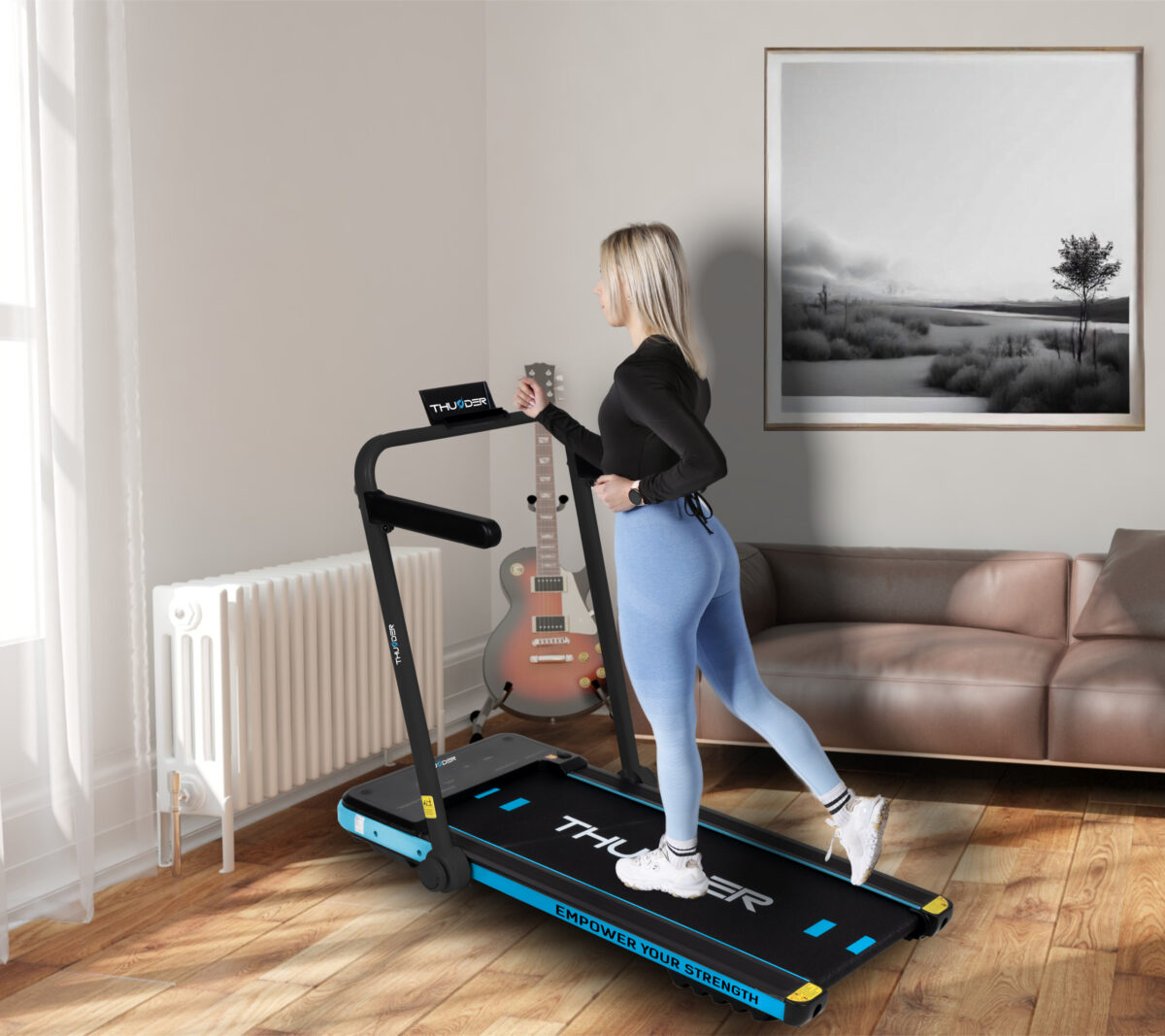 Бігова доріжка електрична THUNDER IMPACT-BLUE-це компактний сучасний тренажер польського бренду THUNDER для ефективних домашніх тренувань. Професійне обладнання преміум-класу з стильним блакитним дизайном, продуманою конструкцією та зручною складною системою — ідеально для маленьких квартир! Забезпечує комфортний біг і ходьбу, легко ховається після використання — надійний помічник для здоров’я та форми!