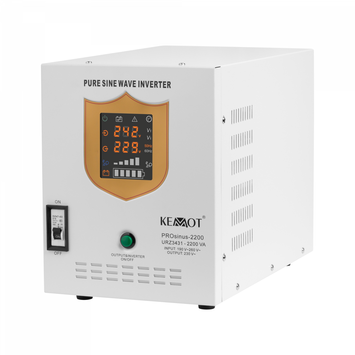Аварійні джерела живлення KEMOT PROSinus оснащені чітким світлодіодним дисплеєм, який відображає поточний робочий стан пристрою. На дисплеї ви можете перевірити, серед іншого: вхідна напруга, вихідна напруга та частота. Крім того, ви можете швидко перевірити рівень навантаження та рівень заряду батареї