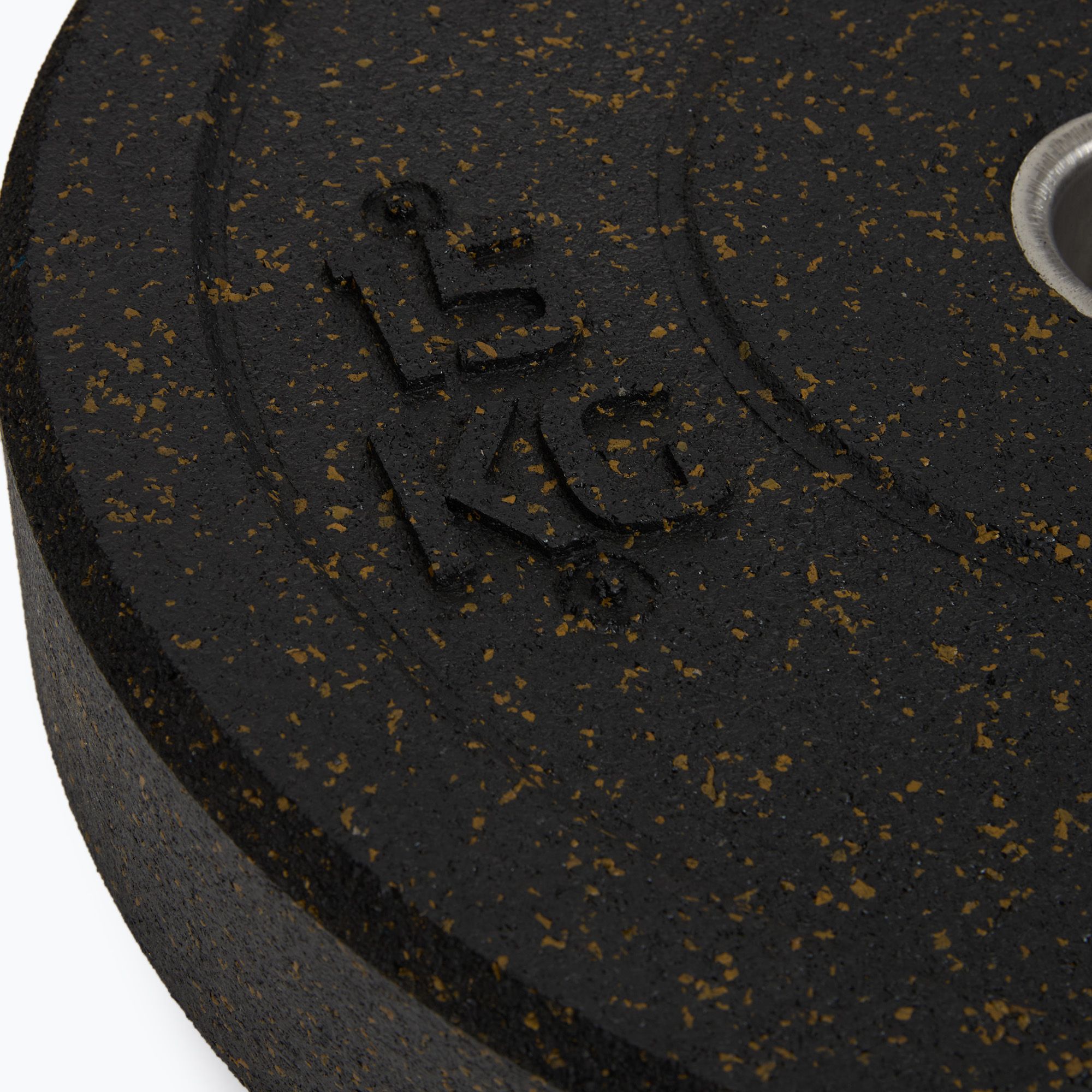 - На додаток до високої стійкості до пошкоджень, бамперний вантаж, виготовлений з гумової гранульованої суміші SBR, має додаткову перевагу – він поглинає вібрації. Властивості гуми забезпечують зниження шуму і ударів при падінні вантажу на підлогу, що сприяє підвищенню комфорту під час тренувань.
