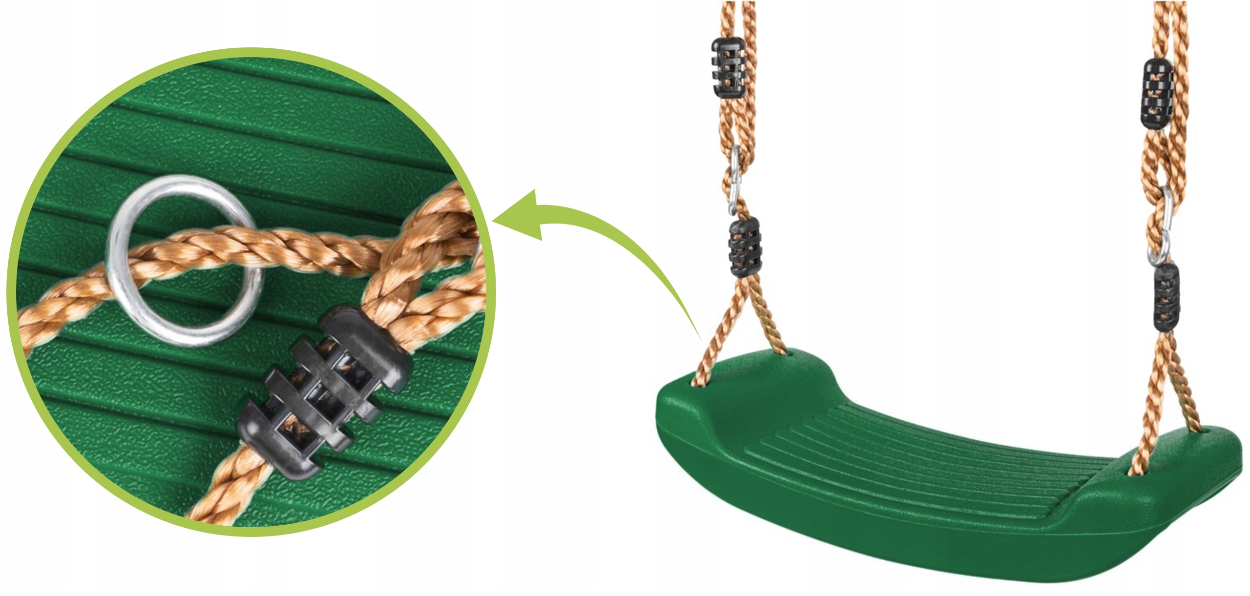 Завдяки цій унікальній конструкції, наші гойдалки можна регулювати та налаштовувати відповідно до потреб вашої дитини. Це рішення дозволяє плавно регулювати висоту гойдалки від 115 см до 190 см від монтажної балки.