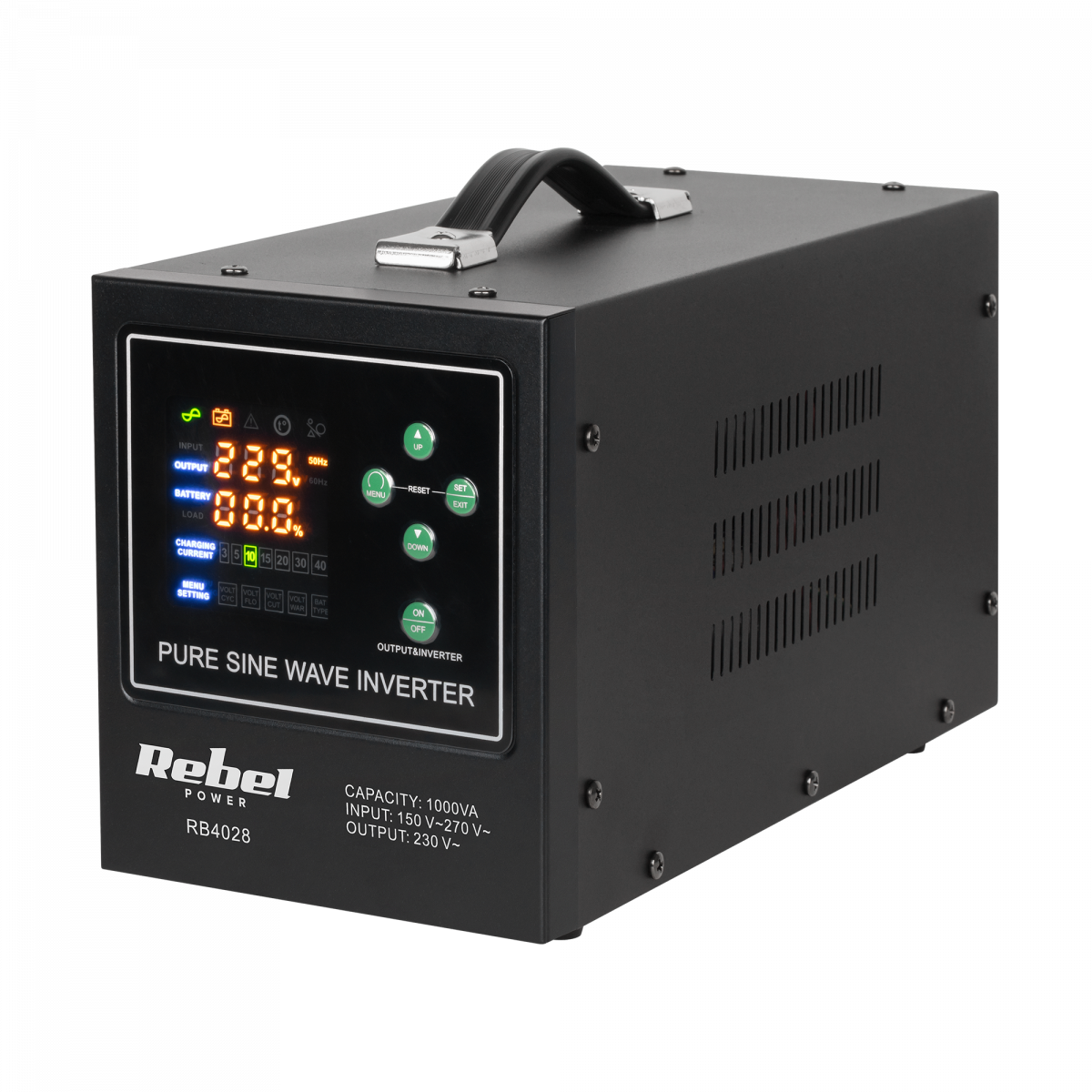 Комфортне використання джерела безперебійного живлення Rebel гарантує чіткий світлодіодний дисплей. Завдяки цьому ви можете легко прочитати поточний робочий стан пристрою, перевірити, серед іншого: вхідна напруга, вихідна напруга та частота. Крім того, ви можете швидко перевірити рівень навантаження та рівень заряду батареї.