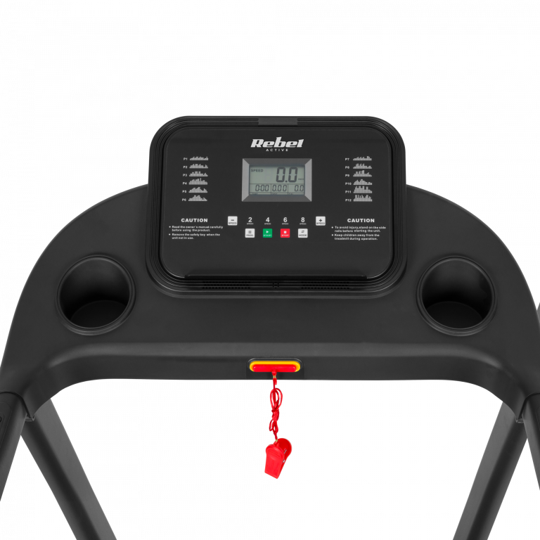 Домашня бігова доріжка Rebel Active також має спеціальний тримач для телефону або планшета, який дозволяє використовувати тренувальні програми, дивитися фільми або слухати музику під час занять. Комфорт під час тренувань також забезпечують практичні полиці для пляшки з водою або ізотонічного напою. Завдяки їм ви можете легко підтримувати належну гідратацію під час тренувань, не припиняючи бігати.