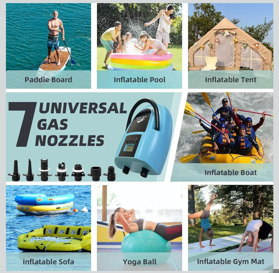 - Широкий спектр застосування: Наш насос для SUP постачається з 7 різними насадками та також підходить для надувних килимків, наметів, доків, м’ячів для йоги, каяків тощо. Для надувних виробів, що потребують тиску менше 1,5 фунтів на квадратний дюйм, високошвидкісний повітряний потік, що створюється основним двигуном, забезпечує швидше надування. Тиск до 20 фунтів на квадратний дюйм можна використовувати для широкого спектру продуктів.