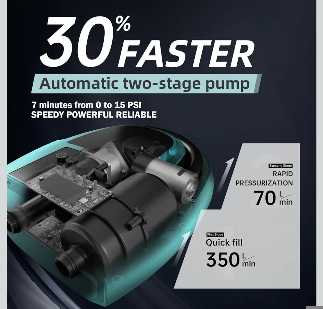 - Інтелектуальний подвійний двигун: Перший двигун 350 л/хв швидко накачує до 1,5 PSI та автоматично перемикається на другий двигун 70 л/хв. Потужний двигун надуває вашу дошку для серфінгу до 15 PSI за 7 хвилин. Програма захисту від перегріву автоматично вимикає живлення, якщо насос перегрівається, запобігаючи пошкодженням та продовжуючи термін його служби.