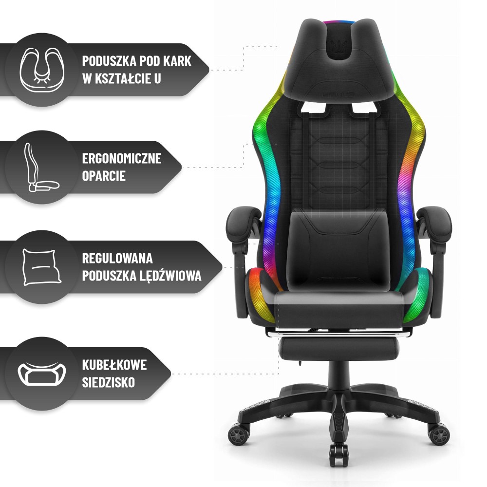 Це крісло складається з багатьох вишуканих деталей, метою яких є максимально можливий комфорт користувача . Крісло HC-1039 2.0 LED поєднує практичність високоякісної тканини з максимально можливою площею світлодіодного підсвічування та оригінальними деталями, такими як поперекова подушка з оригінальним написом та зручні, м’які підлокітники . Весь дизайн виготовлений з перевірених матеріалів, що гарантують найвищий комфорт використання.