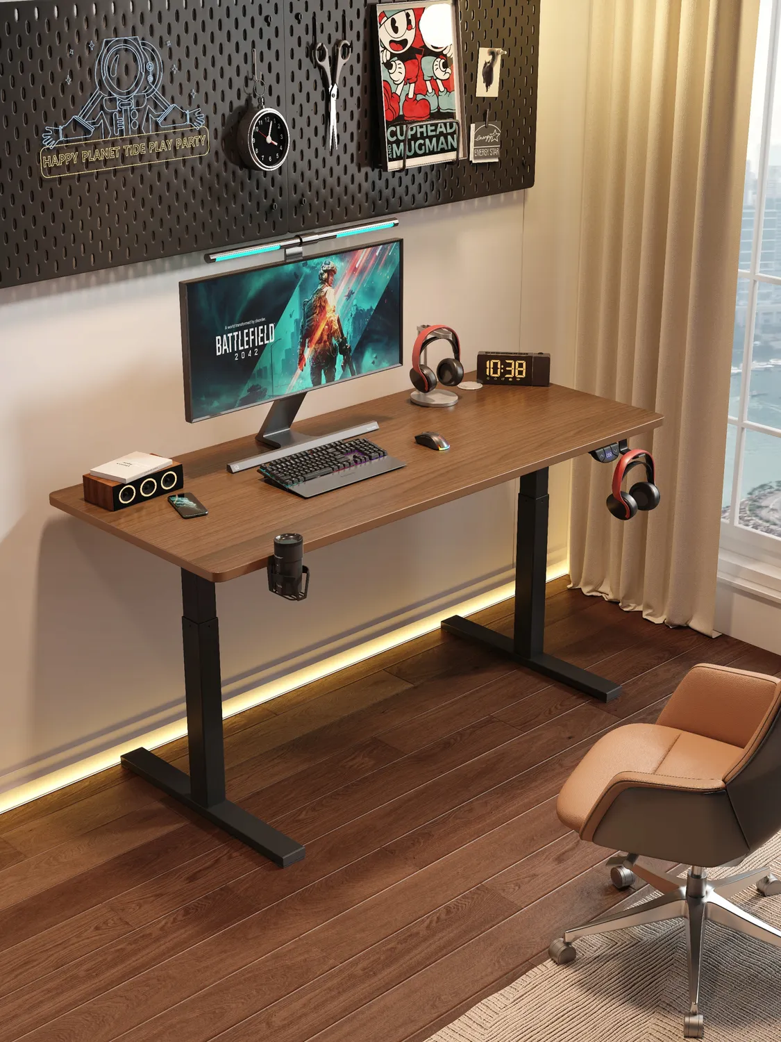 Регульований стіл 140 см, електричне регулювання висоти 72-118 см, світлодіодне підсвічування, додаткова опція, світлодіодне підсвічування, регулювання висоти, електрична рама