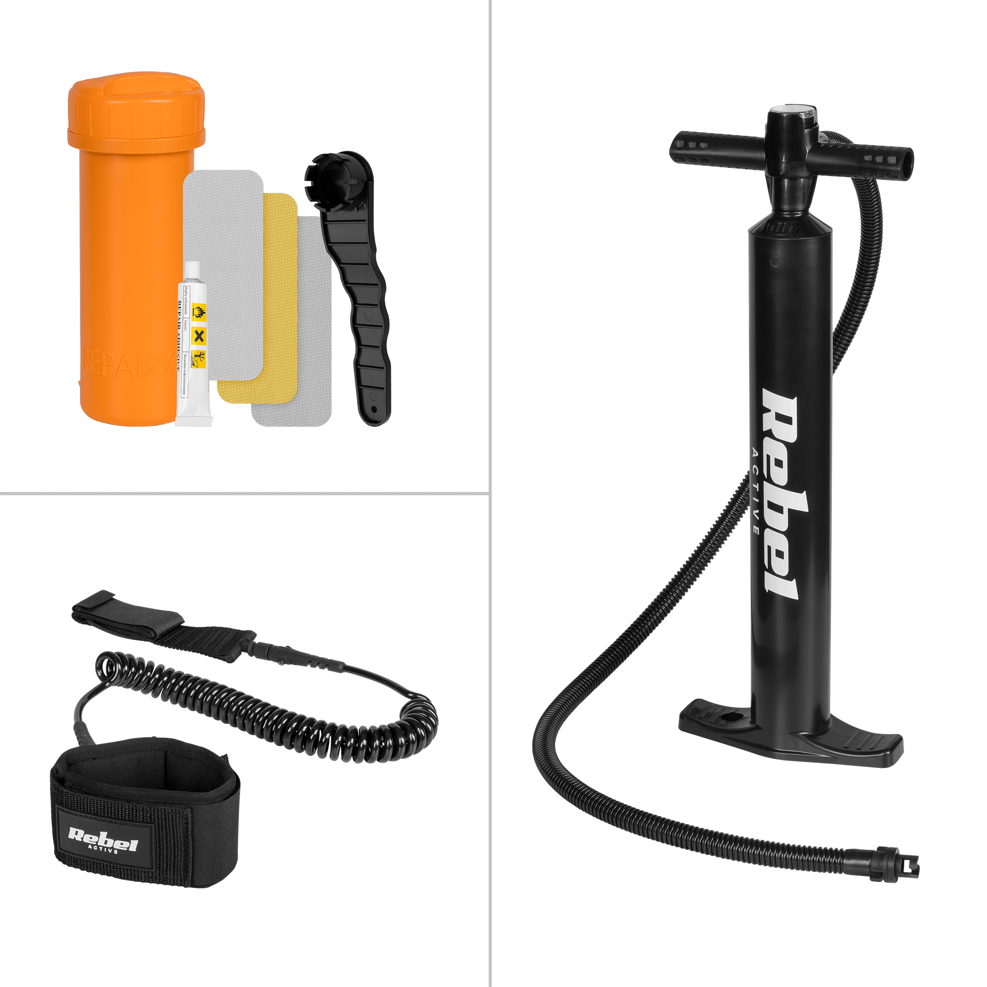 SUP-дошка RBA-4513 постачається з ручним насосом з манометром для швидкого та ефективного надування. Крім того, дошка постачається з ремкомплектом, що складається з ключа для вентилів, трьох латок для ремонту та клею, щоб ви могли швидко виправити будь-які проблеми та повернутися до веслування!