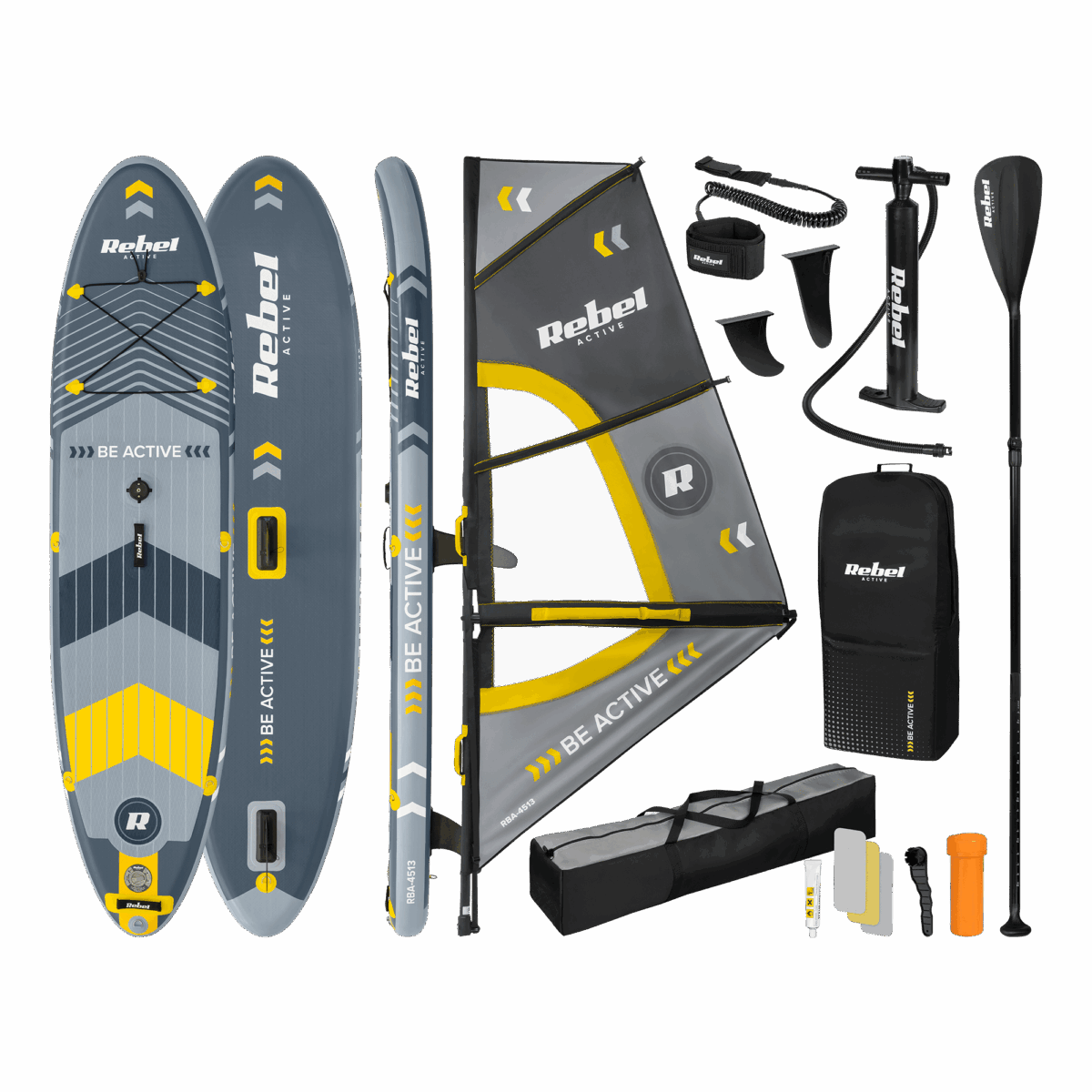 Комплект: 2 x плавники, повідець, весло, вітрило для віндсерфінгу, ручний насос, транспортний рюкзак, ремкомплект (ключ для клапана, ремзашивки, клей)