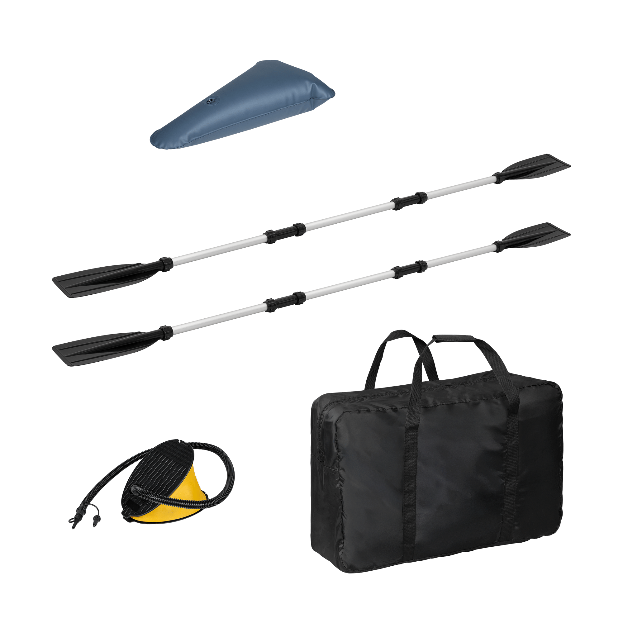 У комплекті: 2 x весло, 2 x спинка, 1 x надувна підставка для ніг, ножний насос, сумка для перенесення, рулетка, латка для ремонту