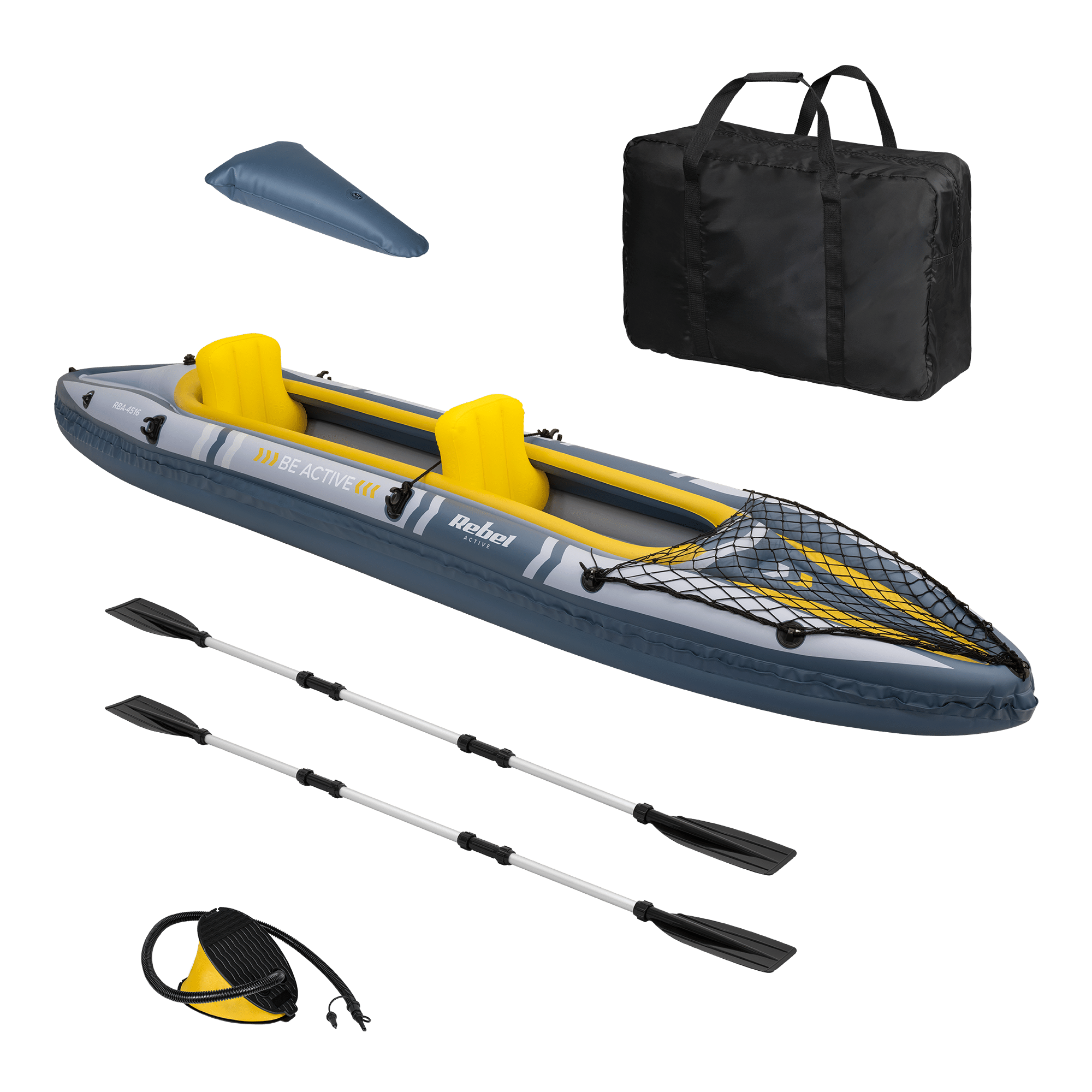 Туристичний каяк Rebel Active постачається з усім необхідним, щоб негайно вийти на воду. Він включає надувну підставку для ніг, два весла, два сидіння, ножний насос, сумку для перенесення, рулетку та латку для ремонту. Цей легкий та компактний комплект легко упакувати та взяти з собою куди завгодно – від озер до прибережних бухт.