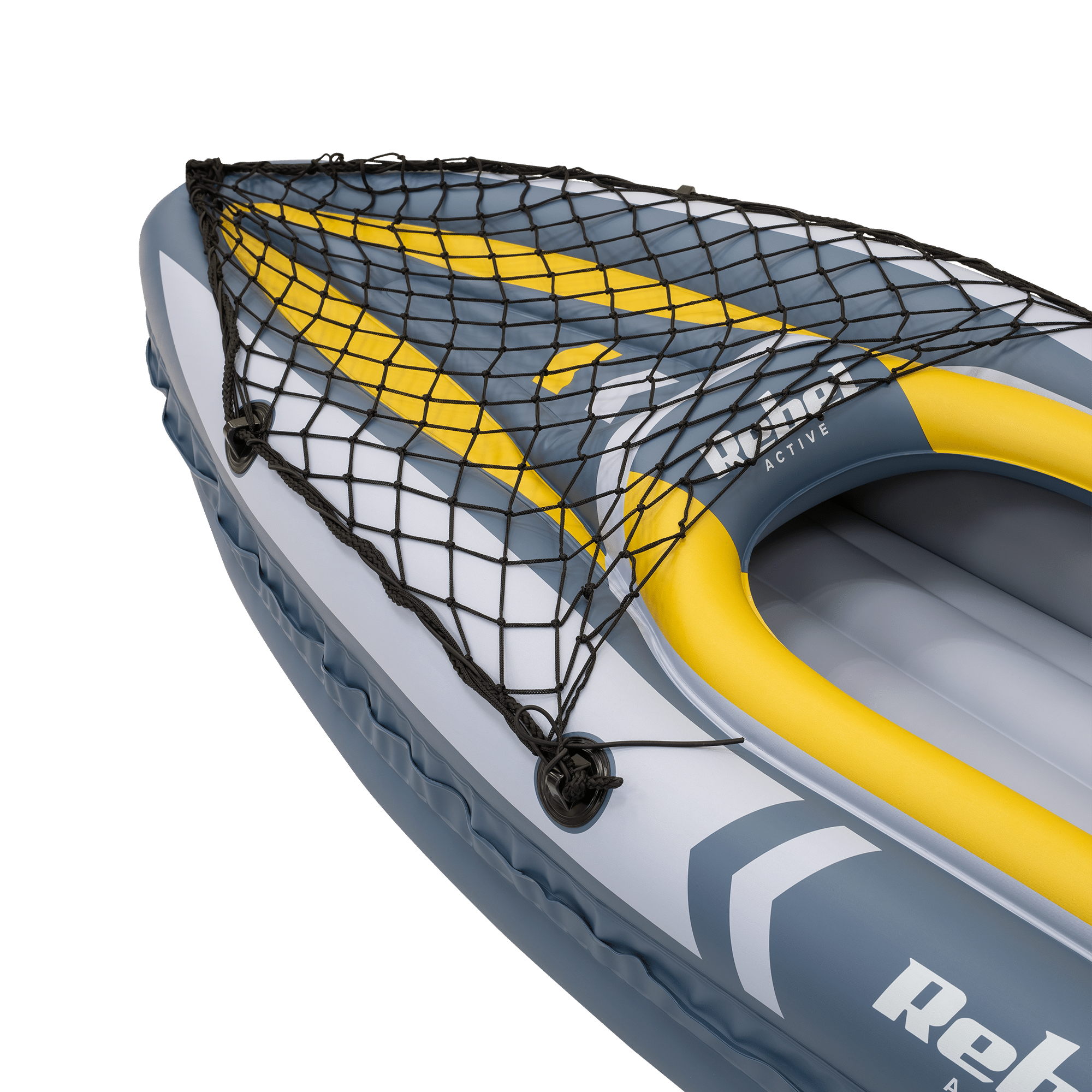 Надувний каяк Rebel Active оснащений носовими та кормовими стропами для зручного транспортування або швартування. Крім того, гнучка носова сітка дозволяє безпечно зберігати багаж, напої та фотообладнання. Це практичне рішення підвищує функціональність та комфорт у кожній поїздці.