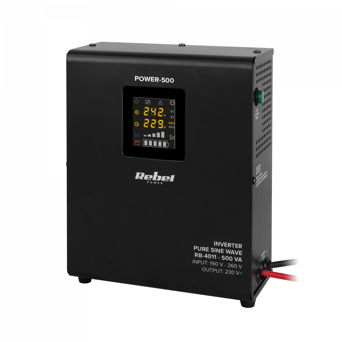 Комфортне використання джерела безперебійного живлення Rebel гарантує чіткий світлодіодний дисплей. Завдяки цьому ви можете легко прочитати поточний робочий стан пристрою, перевірити, серед іншого: вхідна напруга, вихідна напруга та частота. Крім того, ви можете швидко перевірити рівень навантаження та рівень заряду батареї.