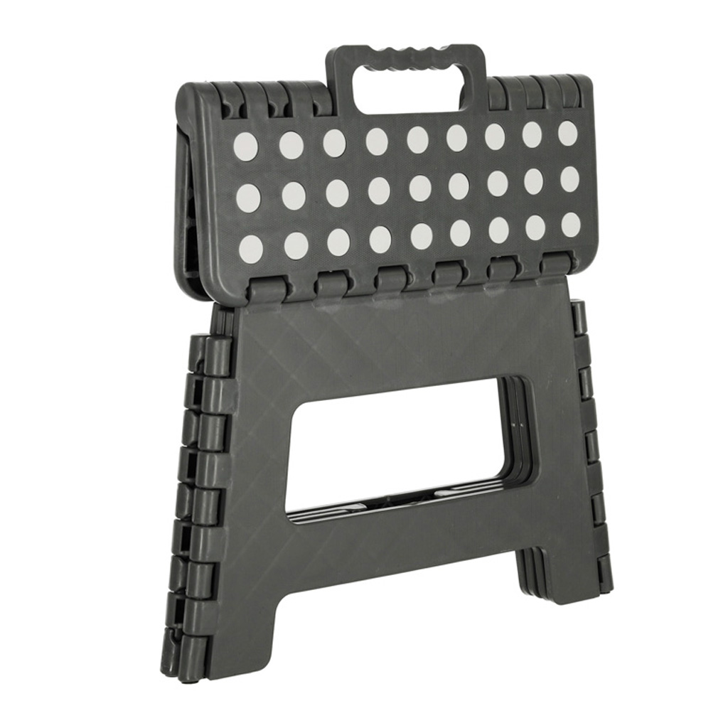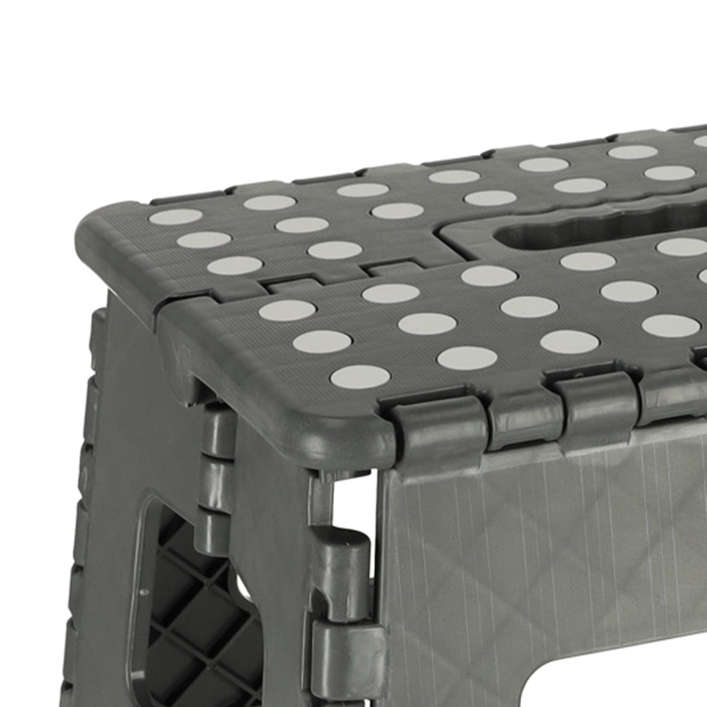 • Складаний стілець темно сірого кольору. Його висота становить 39,5 сантиметрів , що дозволяє легко дістатися до важкодоступних місць. Він складається, тому займає мало місця, коли не використовується. Має нековзне покриття для безпеки під час використання.