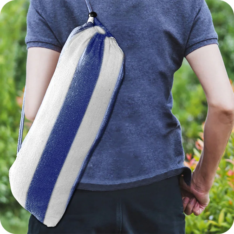 Комплект містить сумку для гамака для зручного зберігання та транспортування. Ця сумка дозволяє взяти лише тканину гамака та підвісити її між деревами за допомогою мотузок, що входять до комплекту.