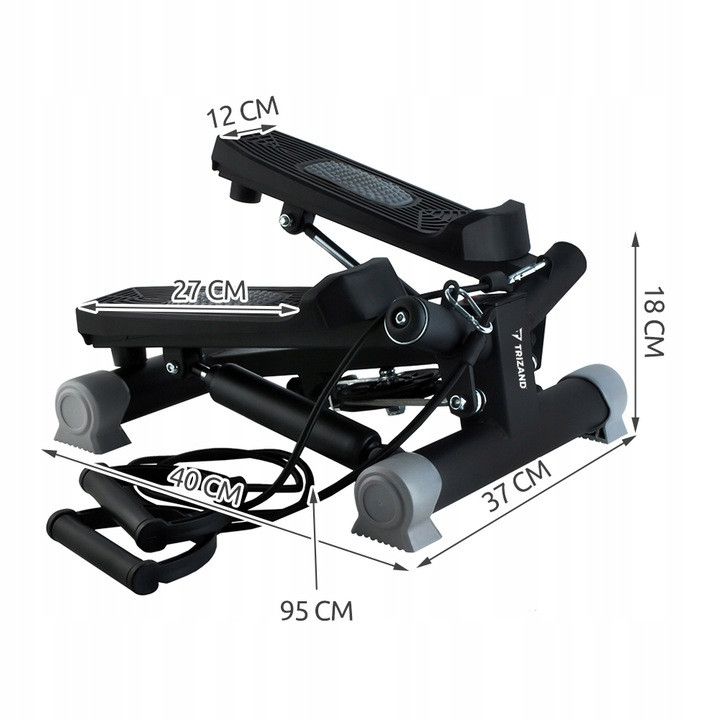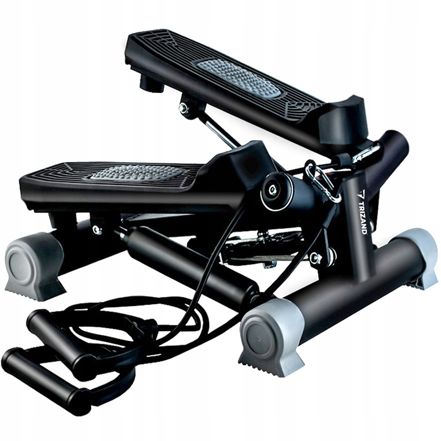 Степпер Trizand 22776 HQ Twist з еспандерами-це компактний домашній тренажер для кардіо-тренувань і зміцнення м’язів ніг, сідниць та рук. Підходить для домашнього використання, не займає багато місця та дозволяє поєднувати крокові вправи з тренуванням верхньої частини тіла завдяки еспандерам.